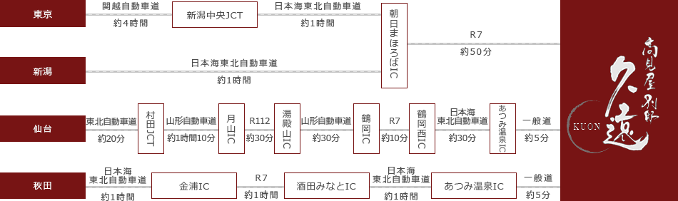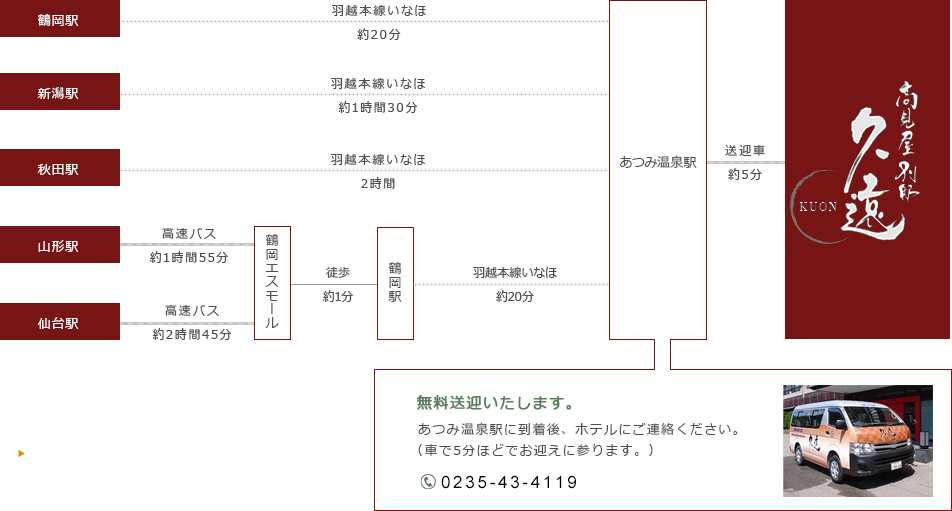 庄内あつみ温泉 高見屋別邸 久遠〒999-7204 山形県鶴岡市湯温海湯の尻83-3TEL: 0235-43-4119