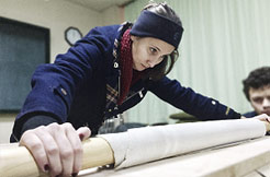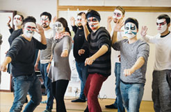 役者の先生の指導の下、歌舞伎独特の化粧法「隈取り」を自分の顔に施し、歌舞伎の所作である「見え切り」を教わります。