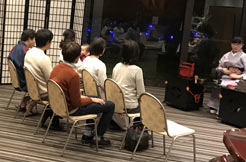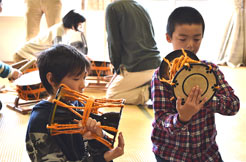 地区に古くから伝わる独特な「座揃囃子(ざぞろいばやし」を観賞後、先生から大ツツミ、小ツツミ、和太鼓などの和楽器の演奏方法を教えてもらい、演奏します。